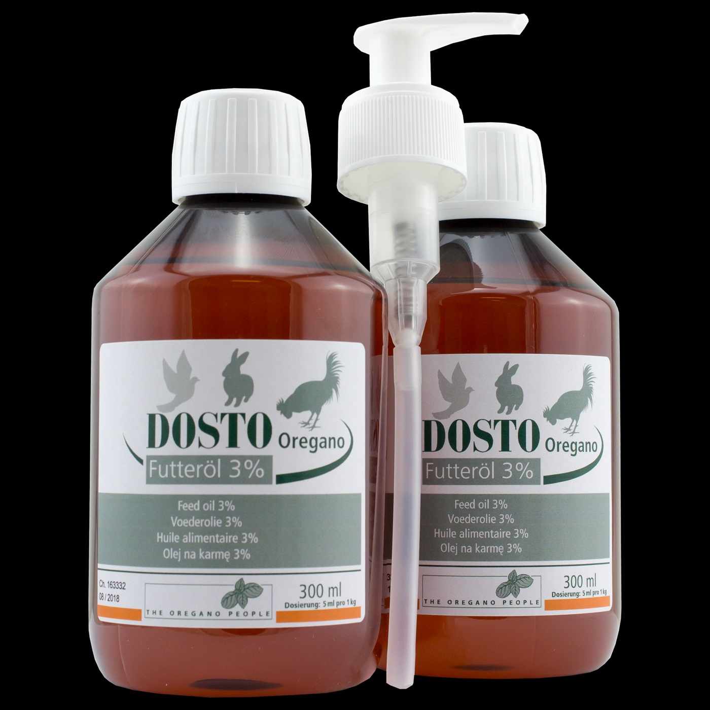 Dosto-Oregano Futteröl 3% jest podawany wyłącznie na karmę. Nie jest rozpuszczalny w wodzie! Jest to idealny produkt dla hodowców preferujących podawanie produktów poprzez karmę. Jedno naciśnięcie dozownika to 2ml oleju. Stadardowe stosowanie 5ml na 1kg karmy.