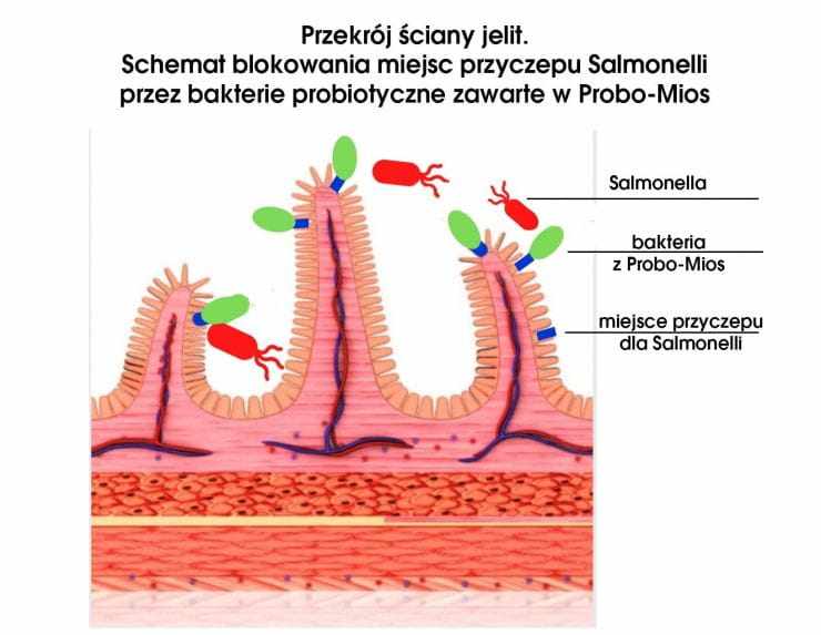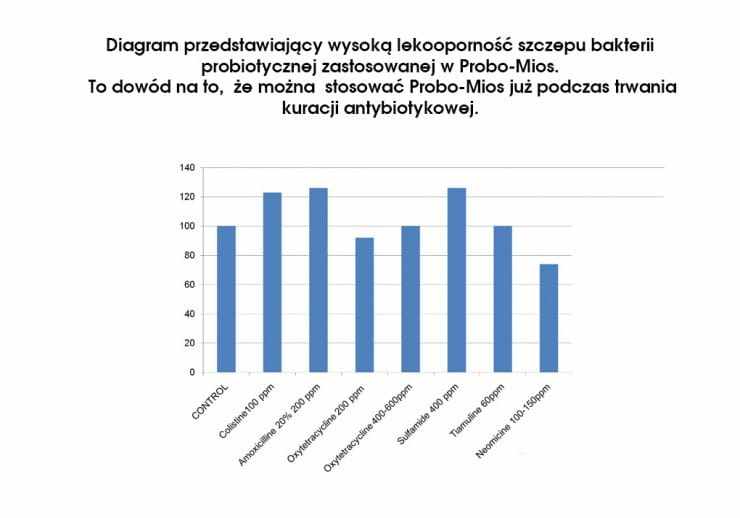 Działa osłonowo przy kuracjach antybiotykowych oraz redukuje wystąpienia chorób bakteryjnych w jelitach wywołanych m.in. przez bakterie Clostridium, E.coli, Salmonella. Zawiera bakterie probiotyczne, które produkują naturalny antybiotyk zwalczający chorobotwórcze bakterie. Dodatkowo zakłóca przekazywanie informacji między bakteriami, co nie pozwala im na uodparnianie się na często stosowane leki. Zastosowane bakterie probiotyczne są na tyle oporne i trwałe, że nie zabije ich nawet żaden antybiotyk, więc można je stosować w czasie podawania leków, aby szybko odbudować florę jelitową. Probo-Mios nie tylko zwalcza biegunkę, ale również leczy stan zapalny dzięki zastosowaniu specjalnej glinki (grey-less) działającej na jelita jak plaster na ranę.