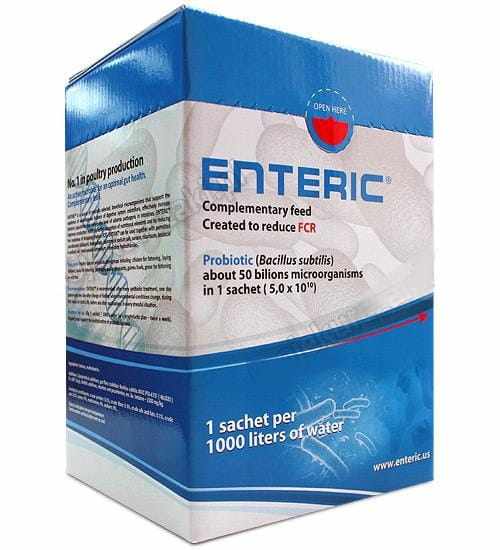 Dzięki opatentowanej technologii wyizolowania szczepu z jelit zdrowych kurcząt, bakterie wytwarzają w przewodzie pokarmowym biocydynę, która hamuje nadmierny wzrost bakterii chorobotwórczych (np: Clostridium perfringens, E.Coli, Salmonella sp.). Enteric to bardzo skoncentrowany liofilizat niezwykle cennych żywych kultur bakterii.