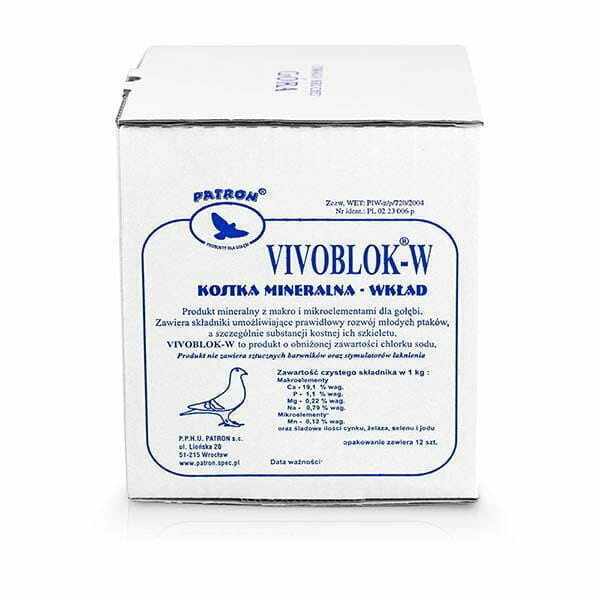 VIVOBLOK-W – to kostka polecana dla młodych, rozwijających się gołębi do drugiego roku życia. Zbilansowany skład surowcowy gwarantuje właściwą budowę całego szkieletu kostnego ptaka. Niezbędna szczególnie dla par wychowujących młode.