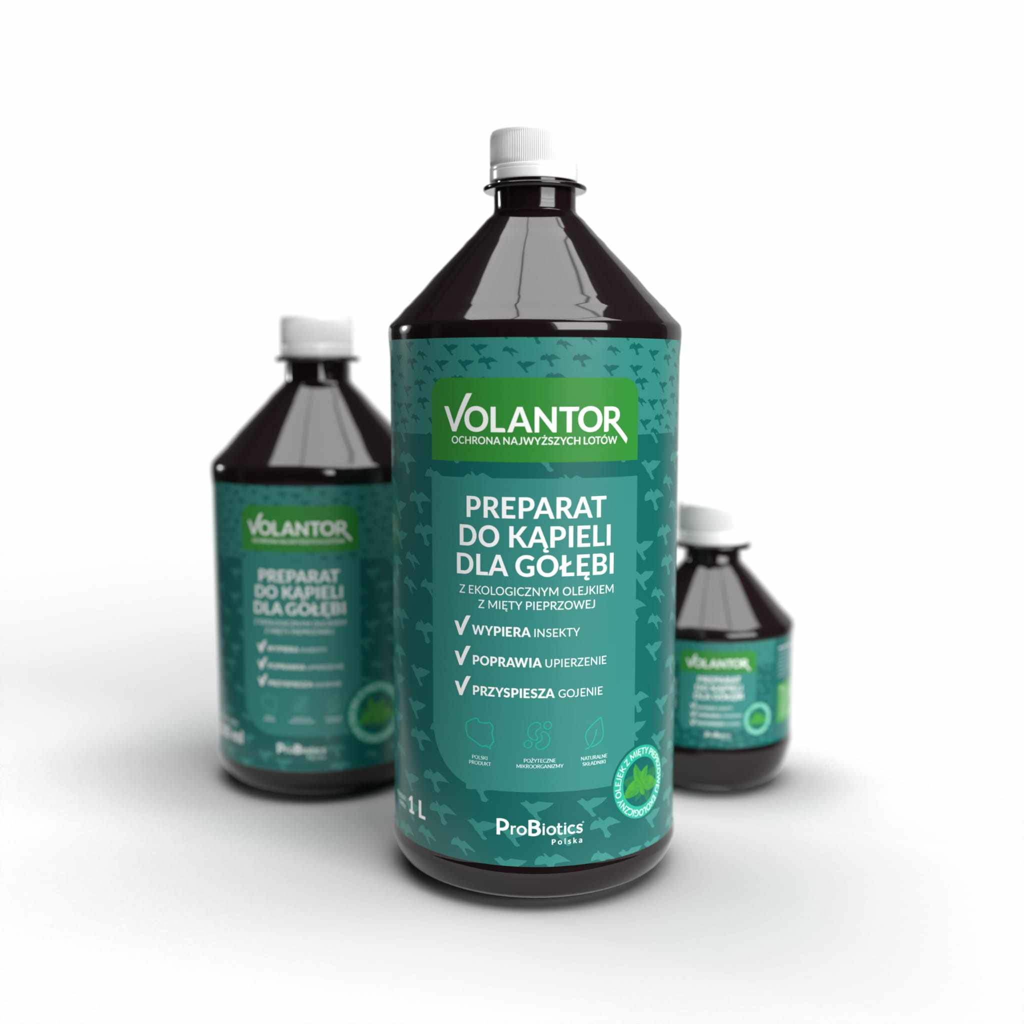 Volantor preparat do kąpieli dla gołębi to naturalny, płynny preparat mikrobiologiczny, niezastąpiony w hodowli gołębia sportowego: pocztowego, akrobatycznego, wysokolotnego. Szczególnie zalecany w okresie przygotowawczym do lotów sportowych, w okresie lęgowym, podczas pierzenia. Stosowany profilaktycznie poprawia dobrostan stada. Zawiera wyłącznie naturalne i niemodyfikowane genetycznie składniki, w tym kompleks żywych, aktywnych, pożytecznych mikroorganizmów.